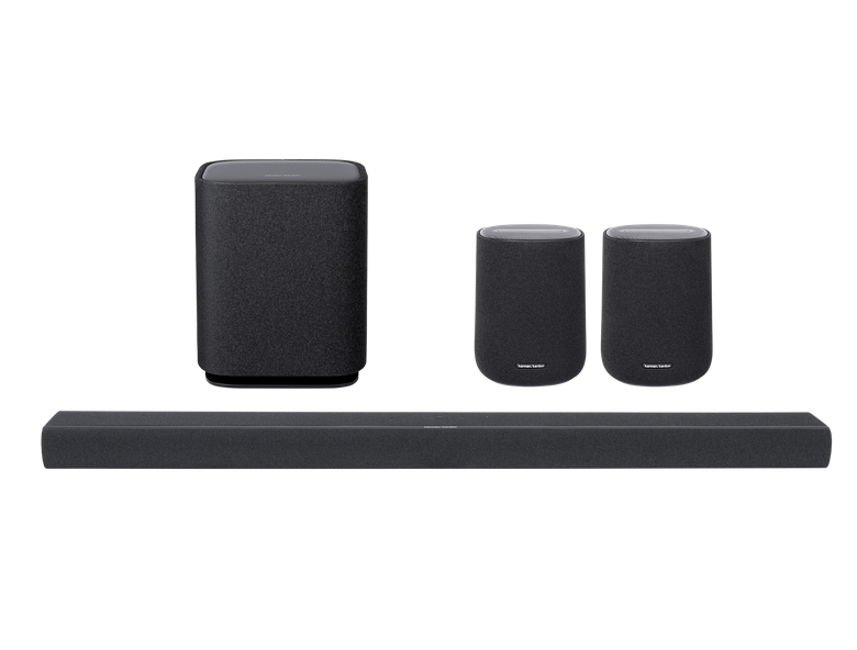 Kompletny zestaw kina domowego Harman Kardon Enchant 7.1.4 oparty na soundbarze Enchant 1100, subwooferze bezprzewodowym Enchant Sub oraz 1 parze kolumn bezprzewodowych Enchant Speakers do zastosowania jako głośniki tylne efektowe w kinie domowym lub niezależnie w innych pomieszczeniach.
