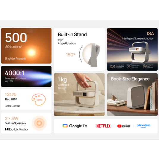 Elfin Flip Plus korzysta z technologii ISA – Intelligent Screen Adaption, która całkowicie eliminuje ręczną konfigurację. To projektor typu plug & play w najczystszej formie – włączasz i oglądasz.